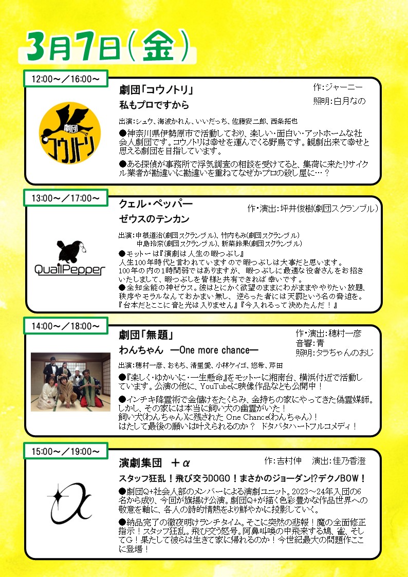 神奈川県下で活動する劇団が集まり、「入場無料、出入り自由」で小作品を連続上演してゆく催しです。