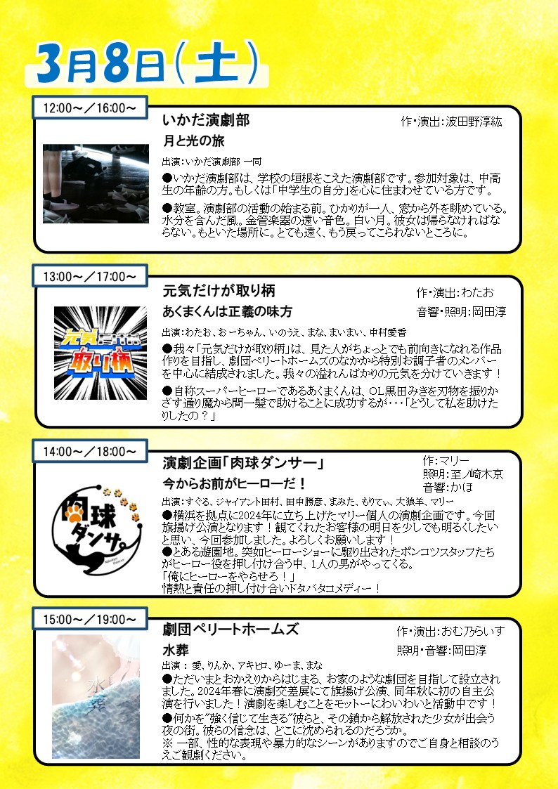 各劇団が1日2回公演を行います。お好きな時間帯にお越しください!