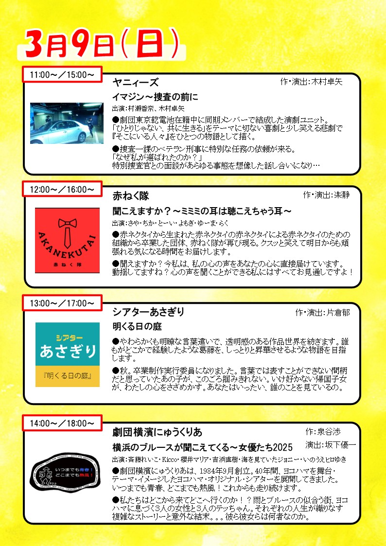 神奈川県下で活動する劇団が集まり、「入場無料、出入り自由」で小作品を連続上演してゆく催しです。